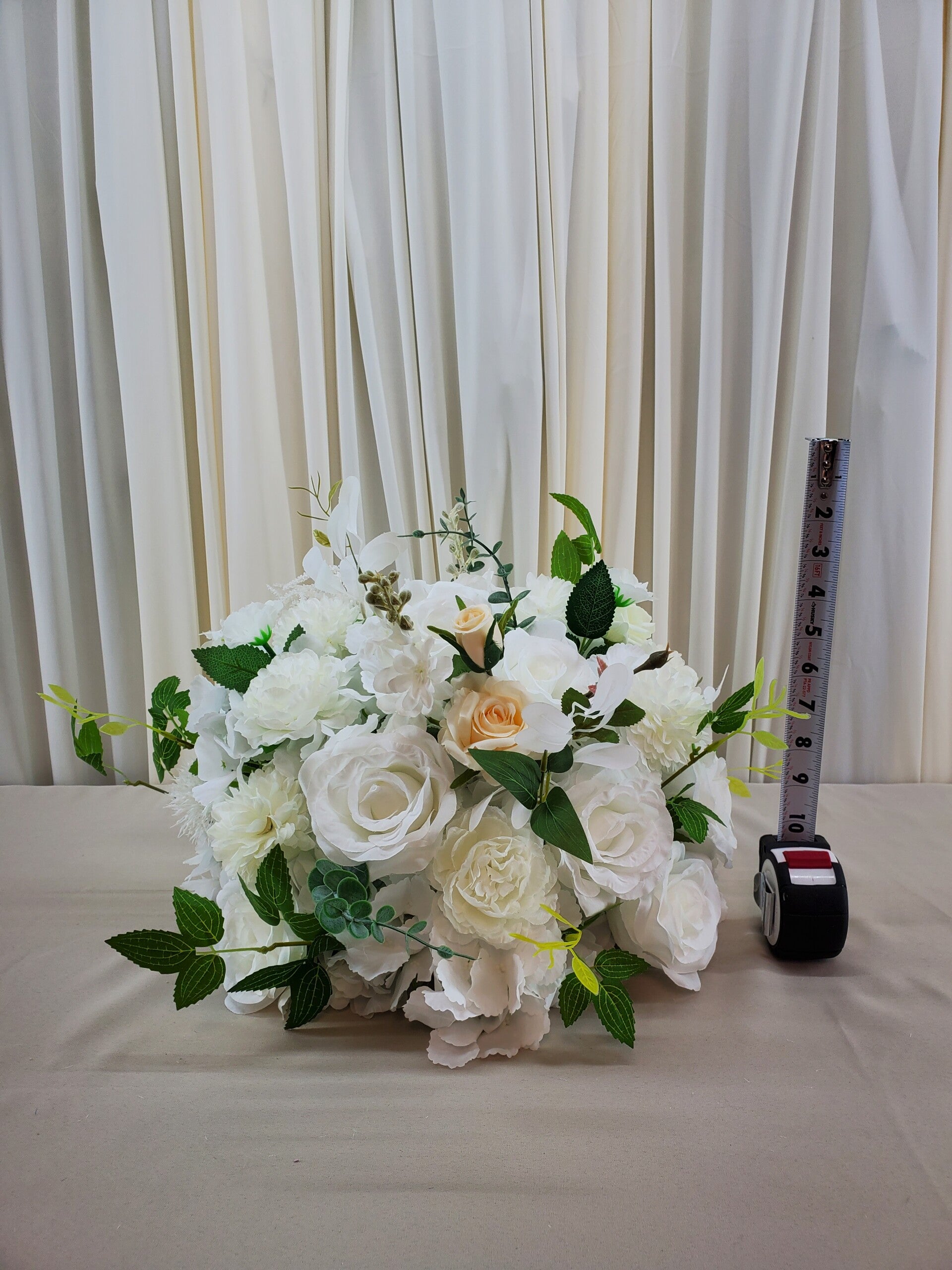 These floral balls are appoximately 11in x 14in. Use them as centerpieces, ground florals or even hang them upside down from the ceiling for a dramatic affect.