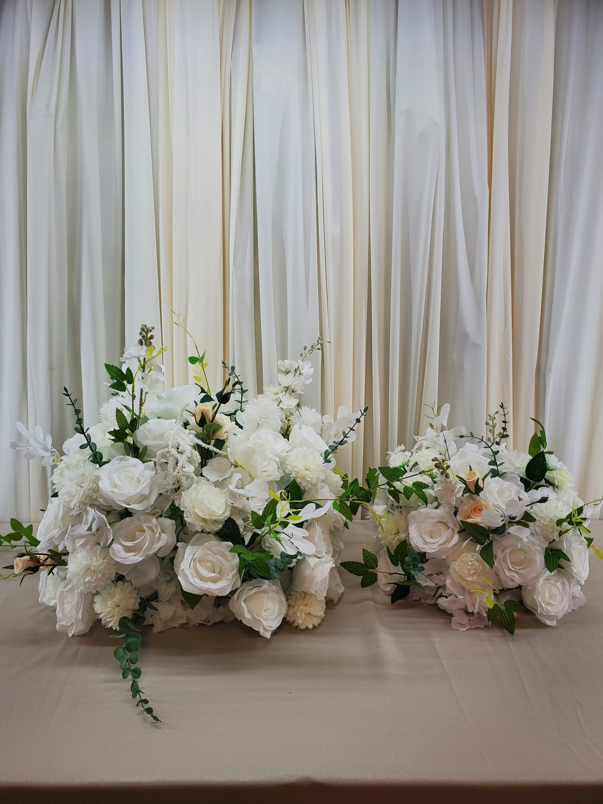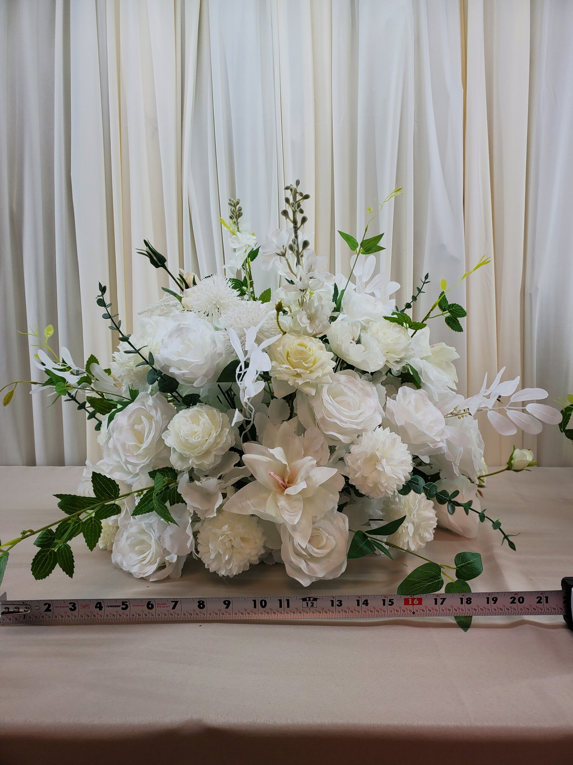 These floral balls are appoximately 18in x 21in. Use them as centerpieces, ground florals or even hang them upside down from the ceiling for a dramatic affect.